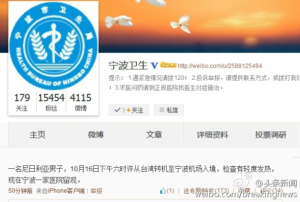 人民網(wǎng)10月17日電 據(jù)寧波衛(wèi)生局網(wǎng)站消息,一名尼日利亞男子昨天下午六時許從臺灣轉(zhuǎn)機至寧波機場,經(jīng)檢查有輕度發(fā)熱。 目前,該男子在寧波一家醫(yī)院留院觀察。…[詳細]