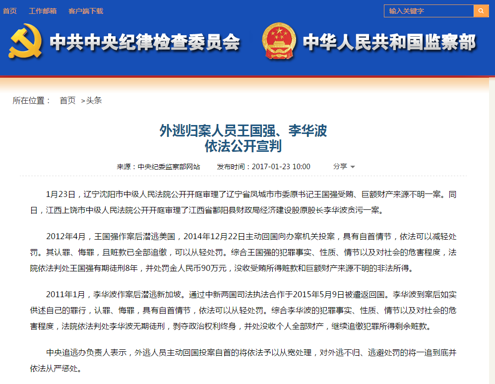 人民網(wǎng)1月25日電 據(jù)中央紀(jì)委監(jiān)察部網(wǎng)站消息,遼寧沈陽市中級人民法院23日公開開庭審理了遼寧省鳳城市市委原書記王國強受賄、巨額財產(chǎn)來源不明一案。同日,江西上饒市中級人民法院公開開庭審理了江西省鄱陽縣財政局經(jīng)濟(jì)建設(shè)股原股長李華波貪污一案。 2012年4月,王國強作案后潛逃美國,2014年12月22…[詳細(xì)]