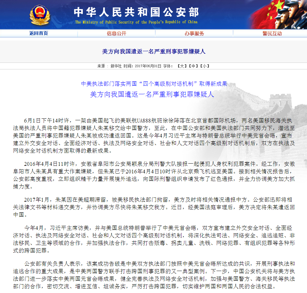公安部網(wǎng)站截圖 人民網(wǎng)6月1日電 據(jù)公安部網(wǎng)站消息,中美執(zhí)法部門落實兩國“四個高級別對話機制”取得新成果。美方1日向我方遣返一名嚴(yán)重刑事犯罪嫌疑人。該案成功告破是中美雙方執(zhí)法部門按照中美元首會晤所達(dá)成的共識,開展刑事執(zhí)法和追逃合作的重大成果,是中美兩國警方聯(lián)手打擊跨國刑事犯罪的又一典型案例。 …[詳細(xì)]