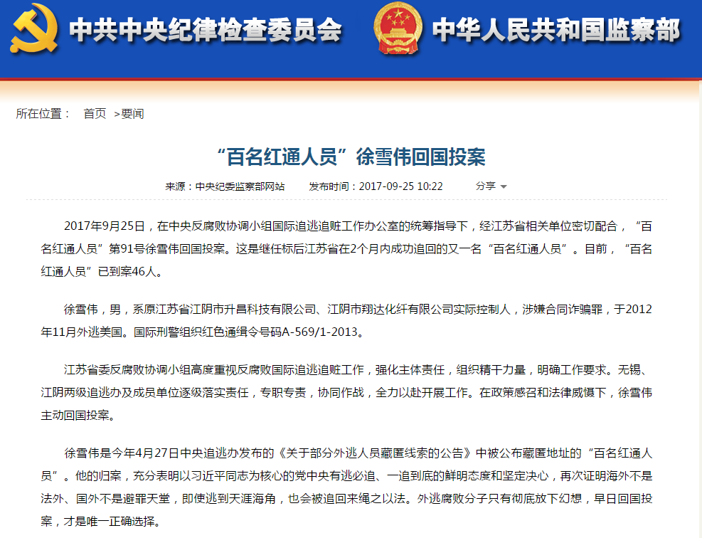 中央紀(jì)委監(jiān)察部網(wǎng)站截圖 人民網(wǎng)9月25日電 據(jù)中央紀(jì)委監(jiān)察部網(wǎng)站消息,在中央反腐敗協(xié)調(diào)小組國際追逃追贓工作辦公室的統(tǒng)籌指導(dǎo)下,經(jīng)江蘇省相關(guān)單位密切配合,“百名紅通人員”第91號徐雪偉回國投案。這是繼任標(biāo)后江蘇省在2個月內(nèi)成功追回的又一名“百名紅通人員”。目前,“百名紅通人員”已到案46人。 …[詳細(xì)]