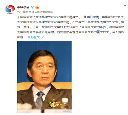 人民網6月18日訊 外交部歐洲司官方微博 @中歐信使13時20分發(fā)布微博證實:中國前駐法大使吳建民在武漢遭遇車禍身亡。官微說,吳大使的溘然離世是中國外交界的重大損失,令人扼腕唏噓。 微博全文如下:6月18日凌晨,中國前駐法大使、外交學院前院長吳建民在武漢遭遇車禍,不幸身亡。吳大使是杰出的外交官,…[詳細]