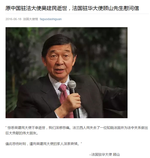 法國駐華使館微博發(fā)布悼文 法國駐華使館微信發(fā)布悼文 人民網北京6月18日電 前駐法大使、外交學院原院長吳建民18日凌晨4時許在武漢因車禍不幸去世,終年77歲。法國駐華大使顧山13時許通過使館微博和微信發(fā)文哀悼,說“法蘭西人民失去了一位知曉法國并為法中關系做出巨大貢獻的偉大朋友”。 …[詳細]