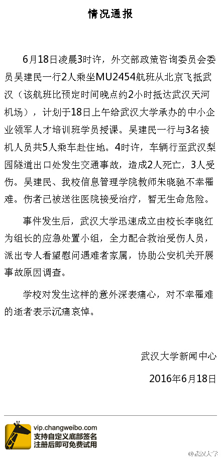 人民網北京6月18日電 6月18日凌晨4時左右,中國前駐法國大使吳建民在武漢遭遇車禍身亡。武漢大學官方微博今日下午發(fā)表聲明,稱對發(fā)生這樣的意外深表痛心,對罹難逝者表示沉痛哀悼。武漢大學將協(xié)助公安機關開展事故原因調查。通報如下:…[詳細]