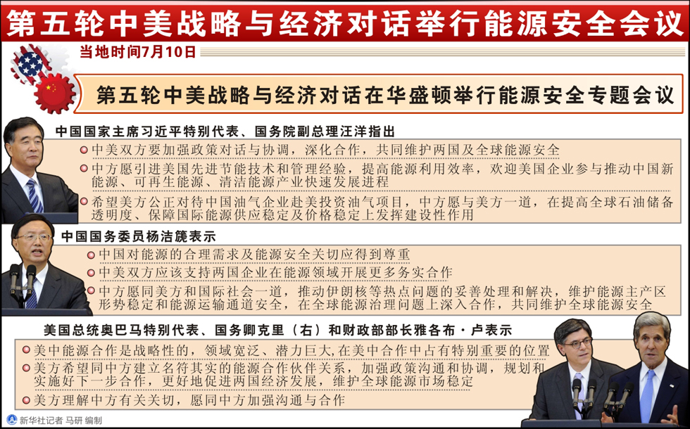 - 第五輪中美戰(zhàn)略與經(jīng)濟(jì)對話7月10日至11日在美國華盛頓舉行。中國國家主席習(xí)近平特別代表、國務(wù)院副總理汪洋和國務(wù)委員楊潔篪同美國總統(tǒng)奧巴馬特別代表、國務(wù)卿克里和財政部部長雅各布·盧共同主持對話。