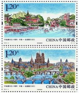 圖1 中法建交五十周年 郵票 2014年,是中國和法國建交五十周年的年份。在這一年的年初,中國郵政就與法國郵政部門共同發(fā)行了《中國與法國建交五十周年》紀念郵票一套2枚(圖1)。郵票被譽為“國家名片”,能登上這個名片是件大事了?v觀新中國郵票,能冠以“建交”的郵票比較少。法國享有這個殊榮。郵票以“…[詳細]