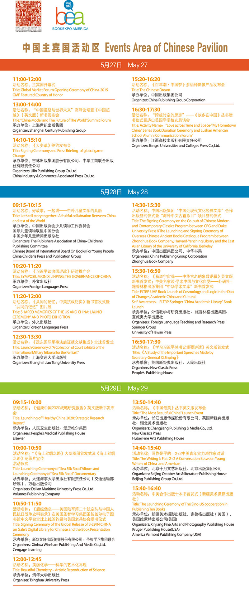 2015美國書展中國主賓國活動(dòng)大幕將啟 《中國新聞出版報(bào)》記者近日從國家新聞出版廣電總局獲悉,5月27日至31日,中國將作為主賓國參加2015美國書展全球市場論壇活動(dòng)。此次中國主賓國活動(dòng)將舉辦作家交流、文化展覽、專題論壇等近130場活動(dòng),集中展示豐富多彩的中國文化和文學(xué)成就,促進(jìn)中國與美國乃至世界各國的文化交流和出版交流。