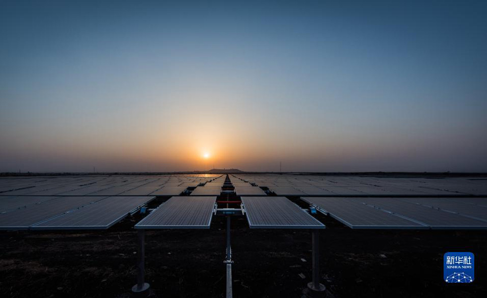2017年4月10日在印度南部城市海德拉巴附近拍攝的一處光伏電站。中國企業(yè)為該電站提供了部分太陽能面板組件和全套的自動日照追蹤支架系統(tǒng)。