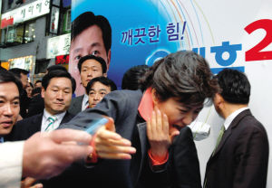 2006年5月20日,樸槿惠作為黨首在首爾參加地方助選活動時,一名男子用文具刀在其右臉上劃出長達(dá)11厘米的傷口,送院后縫了17針。樸槿惠沒有被嚇倒,次月11日,她首次宣布參選大國家黨總統(tǒng)候選人,可惜在黨內(nèi)競選中敗給了后來當(dāng)選總統(tǒng)的李明博。