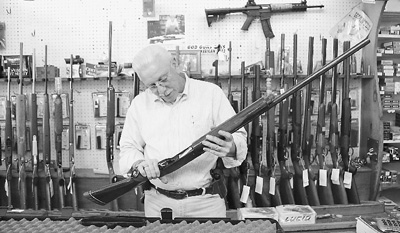本報記者1月17日走進洛杉磯近郊圣加布里埃爾市的“貝恩和戴維斯槍店”時,老板史蒂芬斯基和幾名店員正忙得不亦樂乎:有的向買槍者介紹槍支性能,有的調(diào)試修槍者帶來的故障槍,還有的回答槍支轉讓方面的問題。柜臺后面的墻上,整齊地擺著幾十桿擦得锃亮的步槍、獵槍……(見圖,本報記者陳一鳴攝)