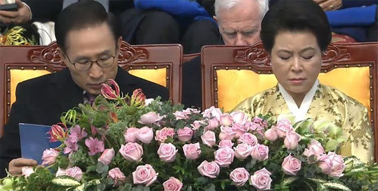 李明博夫婦在現(xiàn)場(圖片來自韓國媒體視頻截圖)