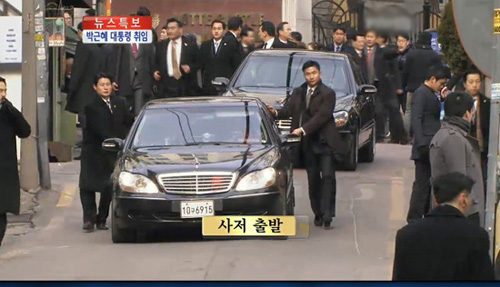 2月25日09:21 人民網(wǎng)駐韓國記者張悅報道 組圖:韓國總統(tǒng)樸槿惠趕赴就職現(xiàn)場