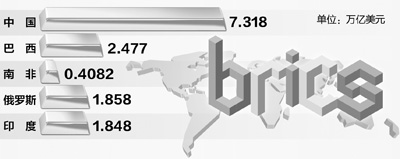 據(jù)統(tǒng)計(jì),金磚國家總?cè)丝诩s占世界總?cè)丝诘?2%。2011年,國內(nèi)生產(chǎn)總值合計(jì)約為13.9萬億美元,占世界總量的19.86%。圖為金磚國家2011年國內(nèi)生產(chǎn)總值。數(shù)據(jù)來源:世界銀行 制圖: 蔡華偉