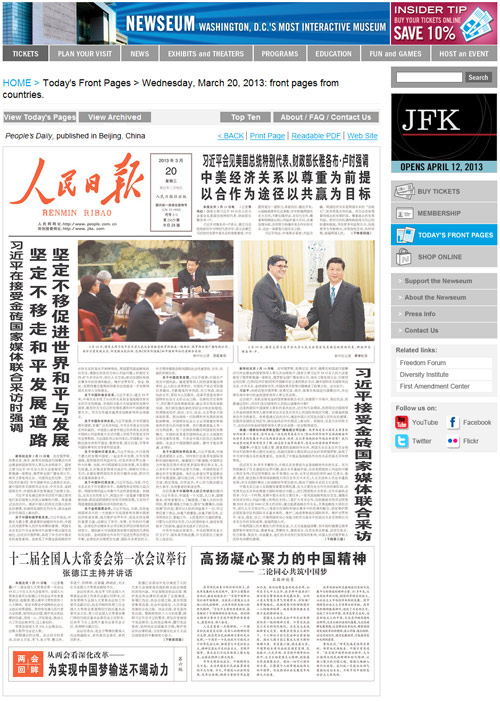 美國(guó)新聞博物館網(wǎng)站登載的3月20日人民日?qǐng)?bào)頭版 來(lái)源:網(wǎng)站截屏