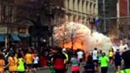 爆炸是在馬拉松冠軍越過終點(diǎn)后兩個(gè)小時(shí)發(fā)生的。第一起爆炸后數(shù)秒鐘又發(fā)生第二起爆炸。這是現(xiàn)場爆炸后的煙霧。