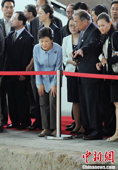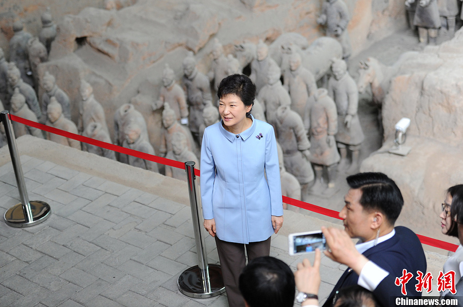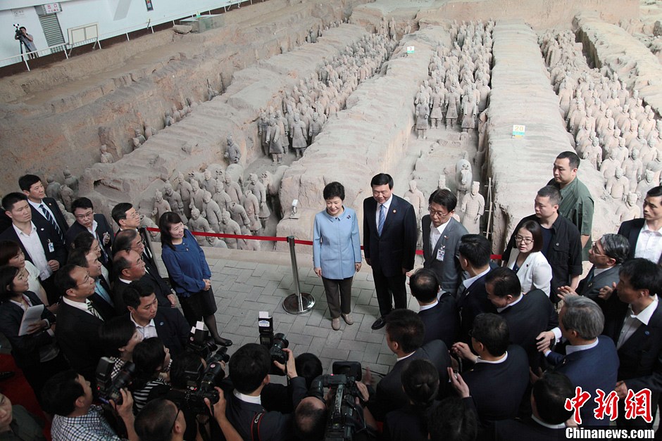 6月30日,韓國(guó)總統(tǒng)樸槿惠前往參觀秦始皇帝陵博物院。作為韓國(guó)歷史上首位女總統(tǒng),樸槿惠于29日抵達(dá)西安,開始2天1夜的訪問(wèn)西安行程,這也是韓國(guó)總統(tǒng)首次訪問(wèn)西安。張遠(yuǎn) 攝