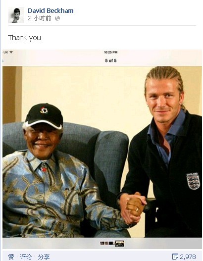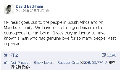 人民網(wǎng)12月6日訊 據(jù)BBC報(bào)道,前英格蘭足球隊(duì)隊(duì)長貝克漢姆在臉書上寫道:“我的心與南非人民和曼德拉的家屬同在。我們失去了一位真正的紳士、勇敢的斗士。能夠認(rèn)識(shí)他這樣一位博愛的人,我感到非常榮幸。安息!”