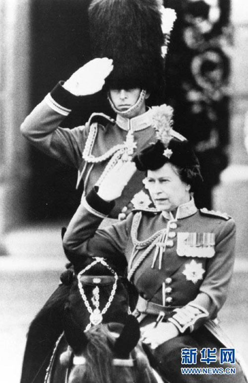 女王是英國世襲國家元首、司法首腦、聯(lián)合王國武裝部隊總司令和英國國教的世俗領(lǐng)袖。這是伊麗莎白二世(前)1980年6月檢閱軍隊的資料照片。