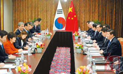 在2013年兩國簽署的《中韓面向未來聯(lián)合聲明》中,雙方一致同意“推動領(lǐng)導(dǎo)人通過頻繁互訪和會晤、互致函電、互派特使、互通電話等方式進行經(jīng)常性溝通”。