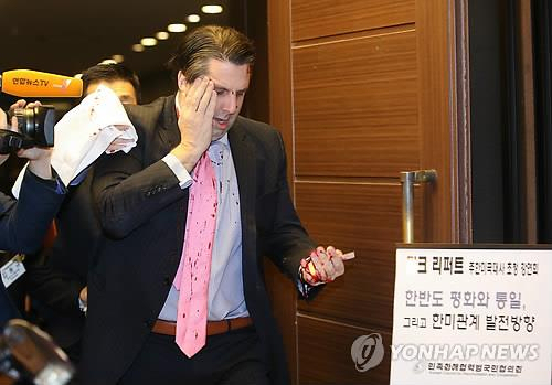 3月5日美國(guó)駐韓國(guó)大使李柏特在首爾市世宗文化會(huì)館出席某早餐會(huì)時(shí),遭反美分子金基宗恐怖襲擊。李柏特右臉顴骨、左前臂及小拇指受重傷,嫌疑人被現(xiàn)場(chǎng)抓獲。