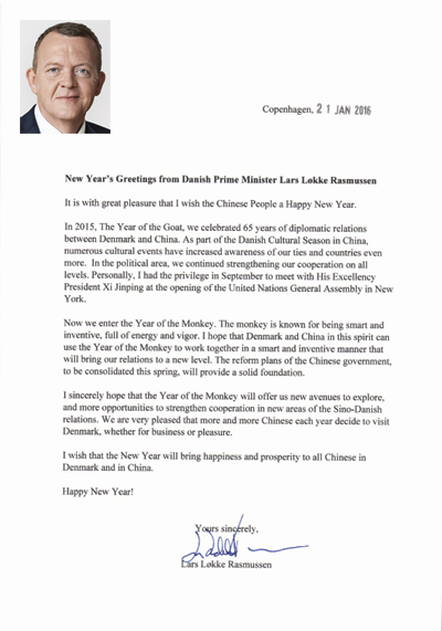 我們即將迎來(lái)猴年,猴以聰明機(jī)靈著稱(chēng),充滿能量和活力。我希望丹中兩國(guó)以猴年為契機(jī),攜手合作,銳意進(jìn)取,開(kāi)拓創(chuàng)新,推動(dòng)雙邊關(guān)系邁向新臺(tái)階。中國(guó)政府將于春季出臺(tái)新的發(fā)展規(guī)劃,必將為兩國(guó)進(jìn)一步合作提供堅(jiān)實(shí)基礎(chǔ)。
