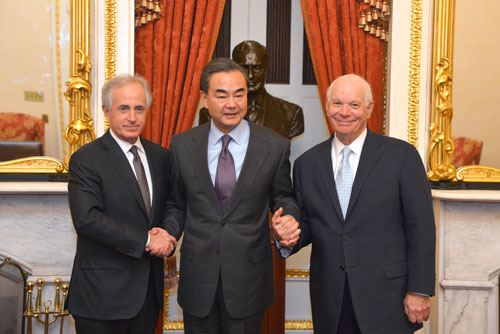 2月24日,王毅在會(huì)見(jiàn)美國(guó)國(guó)會(huì)參院外委會(huì)主席科克、民主黨首席成員卡丁等聯(lián)邦參議員。王毅應(yīng)詢介紹了中方在南海問(wèn)題上的原則立場(chǎng)。