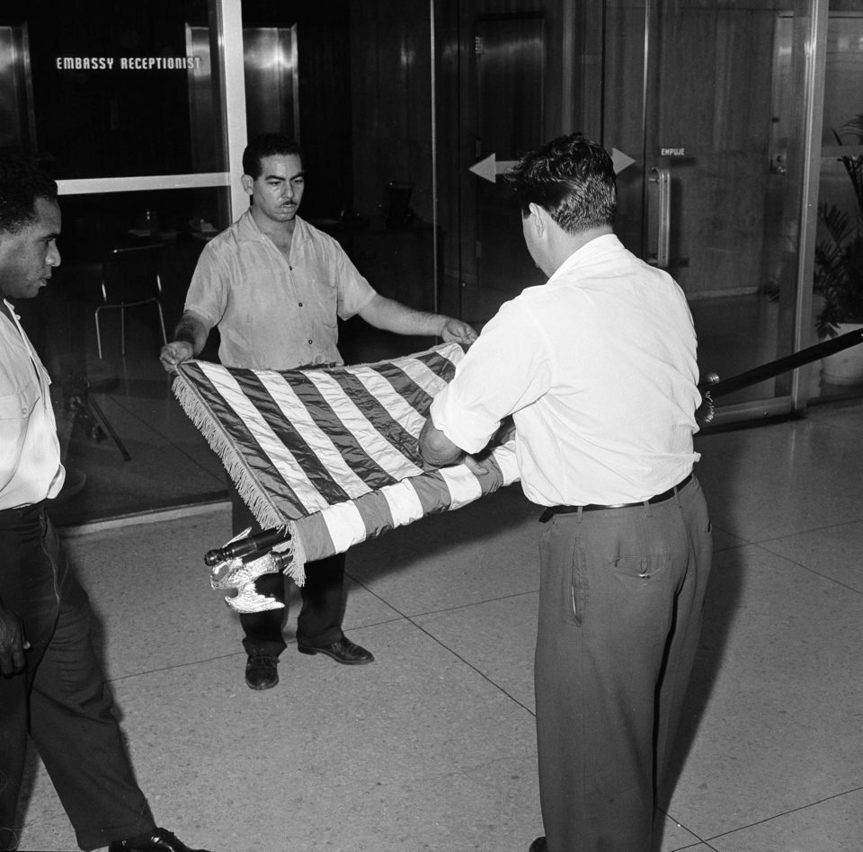 5.1961年,美古斷交。1月3日,美國駐古巴大使館正要卷起美國國旗。