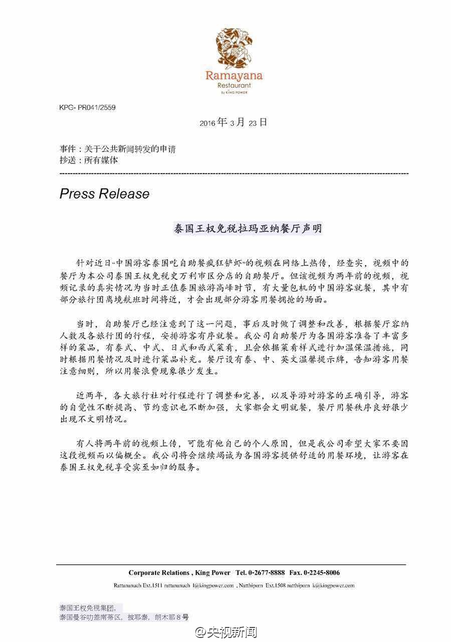 泰國(guó)王權(quán)免稅店3月23日發(fā)聲明,證實(shí)“中國(guó)游客瘋狂鏟蝦”視頻拍攝地為該公司自助餐廳,但為兩年前視頻。當(dāng)時(shí)正值泰國(guó)旅游高峰,有大量包機(jī)的中國(guó)游客就餐,部分旅行團(tuán)離境航班時(shí)間將近才出現(xiàn)擁?yè)寛?chǎng)面。已對(duì)餐廳調(diào)整改善,近兩年用餐秩序良好,很少出現(xiàn)不文明情況。