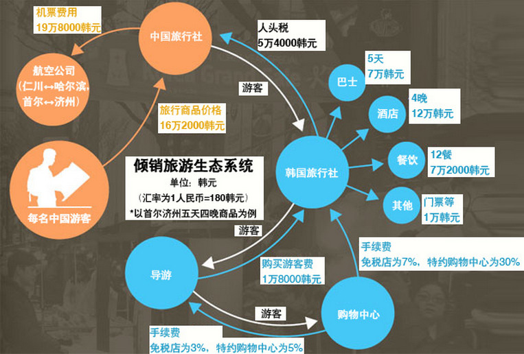 中國(guó)旅行社是甲方,只需要從大批爭(zhēng)著搶奪中國(guó)游客的韓國(guó)旅行社中選擇一家愿意支付較高人頭稅的公司轉(zhuǎn)介游客即可從中獲利。在此過程中,部分“黃金商品(購(gòu)物收益可能較高的旅游團(tuán))”的人頭稅甚至高達(dá)700元人民幣(約合126000韓元)。韓國(guó)業(yè)界的競(jìng)爭(zhēng)使中國(guó)旅行社得以輕松坐收漁利。哈爾濱的發(fā)團(tuán)旅行社在1200元人民幣整體收入(商品價(jià)格+人頭稅)中抽出100元人民幣手續(xù)費(fèi),拿剩余的1100元支付機(jī)票價(jià)格。