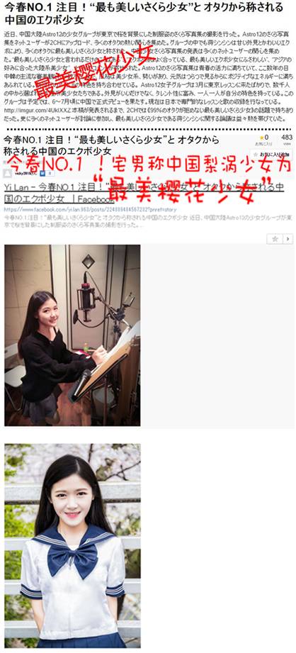 中國(guó)女子偶像組合Astro12在東京拍攝的一組櫻花寫真被日本網(wǎng)友傳到社交媒體2CH論壇上,引起了日本網(wǎng)友的熱烈討論,組合成員蔣晨晨更是被日本宅男評(píng)價(jià)為“最美櫻花少女”。