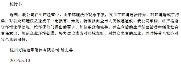 “近期,我公司在生產(chǎn)經(jīng)營中,由于環(huán)境法治觀念不強(qiáng),發(fā)生了環(huán)境違法行為,對環(huán)境造成了污染,對公眾環(huán)境權(quán)益造成了一定損害。為此,特登報向全市人民誠懇道歉!5月13日,杭州萬隆軸承附件有限公司因存在未辦理建設(shè)項目環(huán)保審批手續(xù)、廢水溢流外排等情況被杭州市環(huán)境監(jiān)察支隊責(zé)令停產(chǎn)并對其違法行為立案查處。近日,杭州萬隆軸承附件有限公司向杭州市環(huán)保局提交了檢討書,希望通過媒體向公眾表示誠懇道歉。