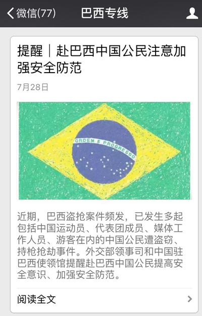 中國(guó)駐巴西使館在微信公眾號(hào)“巴西專線”發(fā)布安全提示