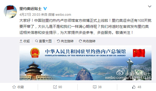 中國(guó)駐里約熱內(nèi)盧總領(lǐng)館在微博賬號(hào)“里約奧運(yùn)貼士”發(fā)布安全提示