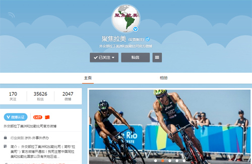 此外,祝青橋還推薦關(guān)注外交部拉美司新浪官方微博“聚焦拉美”。祝司長(zhǎng)說(shuō),“聚焦拉美”和上面提到的微博、微信平臺(tái),會(huì)發(fā)布大量關(guān)于里約奧運(yùn)會(huì)、巴西以及拉美各國(guó)的信息及雙邊關(guān)系最新情況,圖文并茂、生動(dòng)活潑,不少還是前方使領(lǐng)館工作人員發(fā)回的獨(dú)家內(nèi)幕性報(bào)道。