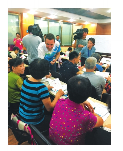 盡管伏天驕陽似火,卻擋不住杭州東山弄社區(qū)沈玉香阿姨去居民活動中心學習英語的熱情。2日下午,記者一行來到東山弄社區(qū)居民活動中心,一推門而入就聽到了朗朗的英語誦讀聲!皉estaurant,餐館!眹H志愿者Tim和另外兩名志愿者一起,正在教居民們學習英語。來學習的居民有老人,也有孩子,但他們學習的目的都一樣——當好G20東道主。東山弄社區(qū)所在的靈隱街道和西湖風景區(qū)相連,居民和國際友人打交道的機會也相對較多!耙淮闻龅揭粋外國朋友問我哪里可以買到蛋糕,我明白他的意思,可卻表達不出來,特別著急!鄙蛴裣惆⒁桃呀(jīng)74歲了,可一想起這件事兒就學習熱情倍增。