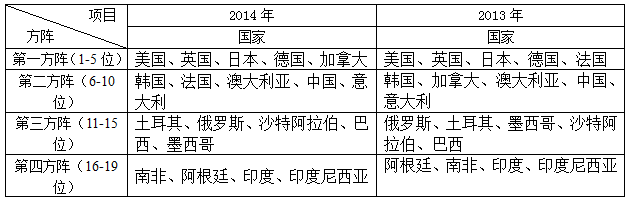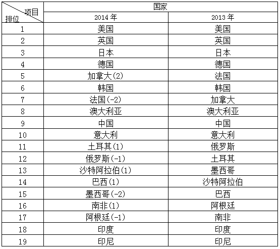 2014年G20國家創(chuàng)新競爭力處于第一方陣(1-5位)的依次為:美國、英國、日本、德國、加拿大;排在第二方陣(6-10位)的依次為:韓國、法國、澳大利亞、中國、意大利;處于第三方陣(11-15位)的依次為:土耳其、俄羅斯、沙特阿拉伯、巴西、墨西哥;處于第四方陣(16-19位)的依次為:南非、阿根廷、印度、印度尼西亞。