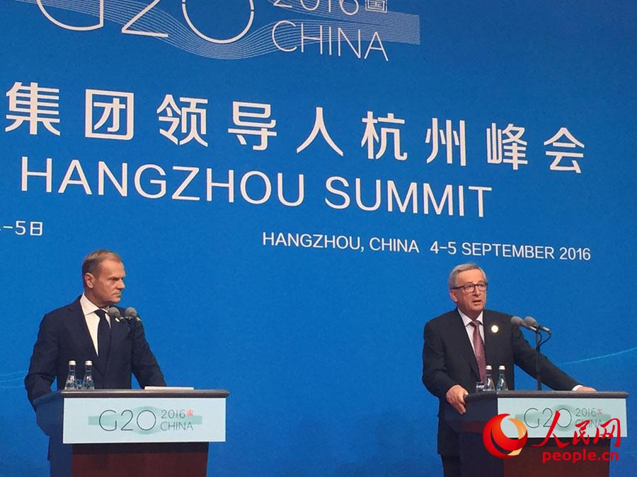 人民網(wǎng)杭州9月4日電 (記者李警銳、楊牧)4日上午,歐盟委員會主席容克和歐洲理事會主席圖斯克在G20杭州峰會新聞中心舉行發(fā)布會。