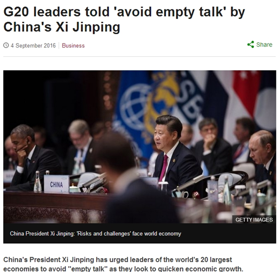 BBC網(wǎng)站發(fā)表文章《習(xí)近平敦促G20領(lǐng)導(dǎo)人避免空談》。文章寫道,習(xí)近平指出,由于市場動蕩,貿(mào)易和投資低迷,全球經(jīng)濟正處在一個“關(guān)鍵當(dāng)口”。