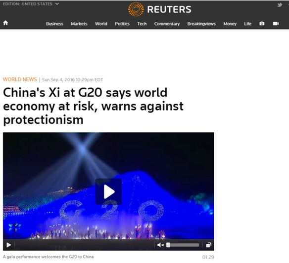 路透社網(wǎng)站報道G20杭州峰會