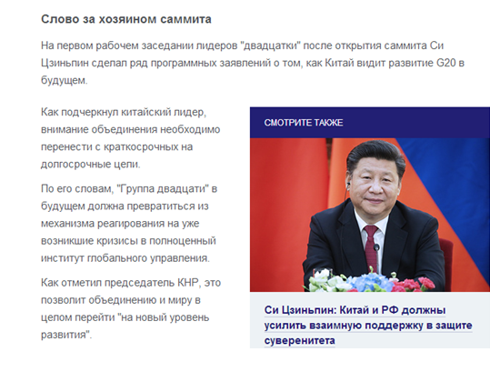 塔斯社報道,在G20峰會開幕式后的第一階段會議上,中國國家領(lǐng)導(dǎo)人習(xí)近平就“中國如何看待G20未來發(fā)展”這一問題發(fā)言。他在發(fā)言中指出,二十國集團未來應(yīng)當(dāng)從一個“危機應(yīng)對機制”轉(zhuǎn)變?yōu)橐粋“真正的全球治理機構(gòu)”,使得G20乃至全球發(fā)展都上升到一個新水平。