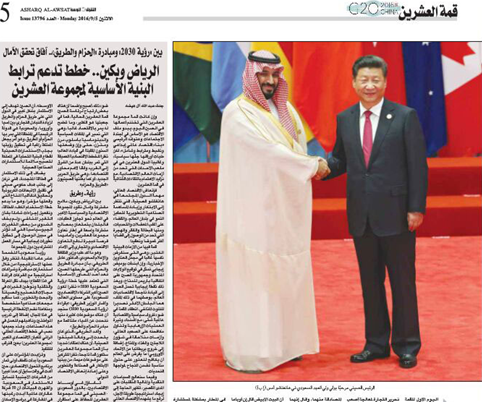 沙特《中東報》聚焦G20杭州峰會:力促經(jīng)濟可持續(xù)發(fā)展。阿拉伯世界知名大報——沙特《中東報》連續(xù)數(shù)日積極報道G20會議及沙特副王儲訪華,并于今日發(fā)布G20專版,稱沙特“2030愿景”與中國“一帶一路”倡議的戰(zhàn)略互聯(lián)前景廣闊。并指此次峰會中國提出了支持新興市場國家和發(fā)展中國家,其中包括一些非洲國家,這也使得杭州峰會不同于以往其他20國集團首腦會議。