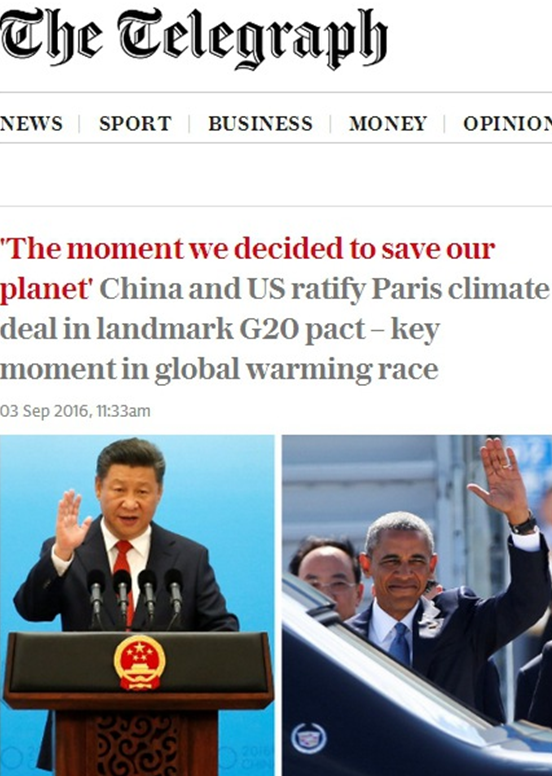 《每日電訊報》首頁報道中美批準(zhǔn)氣候變化《巴黎協(xié)定》