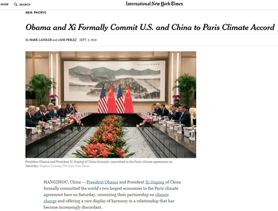 紐約時報網(wǎng)關(guān)注中美批準(zhǔn)氣候變化《巴黎協(xié)定》