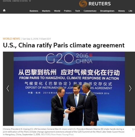 路透社聚焦中美兩國元首向聯(lián)合國秘書長潘基文交存《巴黎協(xié)定》批準(zhǔn)文書