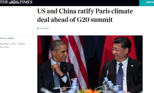 泰晤士報關(guān)注中美批準(zhǔn)氣候變化《巴黎協(xié)定》