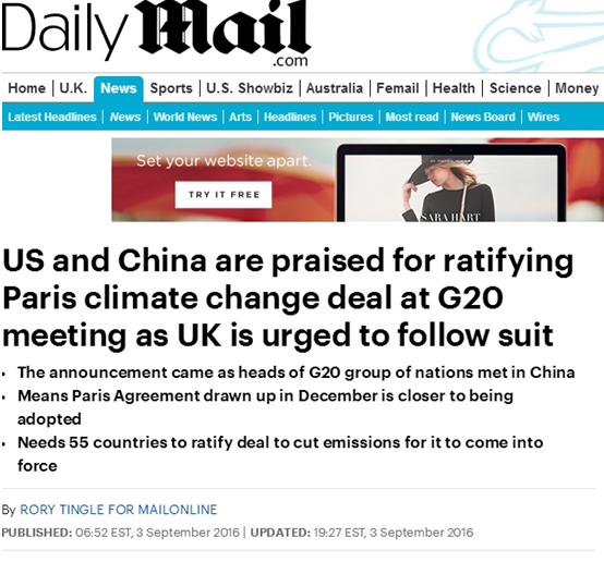 英國《每日郵報》報道稱,G20峰會上中美批準(zhǔn)氣候變化《巴黎協(xié)定》受贊賞,英國被敦促效仿。