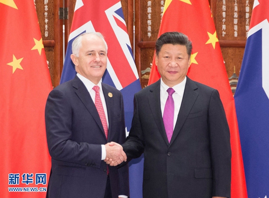 9月4日,習(xí)近平主席會(huì)見(jiàn)澳大利亞總理特恩布爾。特恩布爾表示,澳中傳統(tǒng)友好,兩國(guó)全面戰(zhàn)略伙伴關(guān)系在澳國(guó)內(nèi)受到廣泛支持。澳方致力于積極落實(shí)澳中自貿(mào)協(xié)定,愿深化兩國(guó)經(jīng)貿(mào)關(guān)系,繼續(xù)歡迎中國(guó)對(duì)澳投資。澳方支持中方成功舉辦二十國(guó)集團(tuán)領(lǐng)導(dǎo)人杭州峰會(huì)。
