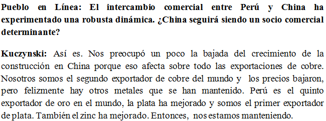 庫琴斯基:當(dāng)然是。我們對中國經(jīng)濟(jì)建設(shè)增速的放緩略表擔(dān)憂,因為這影響了秘魯產(chǎn)品尤其是銅礦的出口。秘魯是世界第二大銅礦出口國,銅礦價格不斷下降,比較幸運的是,有其他金屬在支撐整個礦業(yè)。秘魯還是世界第五大黃金出口國和第一大白銀出口國,鋅的出口也有所提升,所以秘魯整個礦業(yè)基本還是維持著平衡。