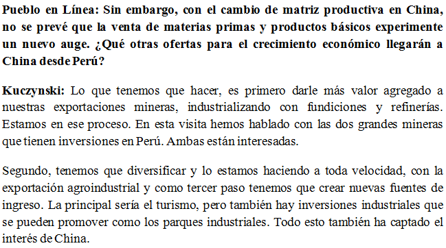 庫琴斯基:我們首先需要做的就是,提高礦業(yè)出口產(chǎn)品的附加價值,實現(xiàn)鑄造業(yè)和煉油的工業(yè)化生產(chǎn)。訪問期間,我們已經(jīng)和兩大中國礦產(chǎn)企業(yè)交流,他們都表示對投資秘魯很感興趣。