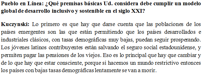 庫琴斯基:首先需要意識到的是,新興經(jīng)濟(jì)體國家是允許人口增長率很低的發(fā)達(dá)國家和工業(yè)國家繼續(xù)繁榮發(fā)展的。實(shí)際上拉美國家的年輕移民是在拯救美國的社會保障,是他們的納稅在保障老年人的養(yǎng)老金。這才是最需要改變也最需要引起人們注意的主要方面,如果將人們都禁錮于各個(gè)國家內(nèi),那些低人口增長率的發(fā)達(dá)國家將會消亡殆盡。