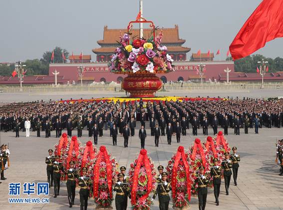 9月30日,黨和國(guó)家領(lǐng)導(dǎo)人習(xí)近平、李克強(qiáng)、張德江、俞正聲、劉云山、王岐山、張高麗等來(lái)到北京天安門(mén)廣場(chǎng),出席烈士紀(jì)念日向人民英雄敬獻(xiàn)花籃儀式。(新華社發(fā))
